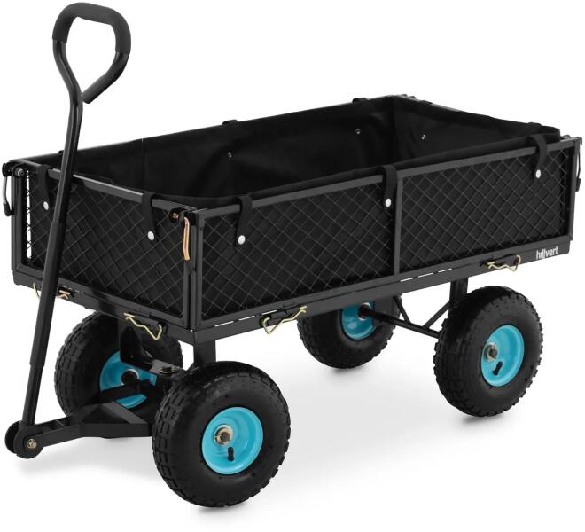 Ha jó idő van, akkor az kirándulást jelent. A szabadtéri tevékenységekhez a HT-TWIN 300 összecsukható kerti kocsi az ideális felszerelés. Termékünk összecsukott állapotban rendkívül helytakarékosan szállítható az autóban, a megérkezést követően pedig telepakolható a szükséges felszerelésekkel - legyen szó erdei sétáról, a parkról, vagy strandolásról. A tartós acélból és műanyagból készült szállító kocsi rakodófelületén minden szükséges tárgy elfér, például játékok, egy rekesz sör, ételek, grillfelszerelés vagy kényelmes plédek. Termékünk teherbírása 300 kg, így szinte bármit magával vihet a kirándulásra. Az utazás megkezdése előtt a kézikocsi egyszerűen kinyitható. Tulajdonságainak köszönhetően a kerti kiskocsi rendkívül kényelmesen használható, illetve szükség esetén helytakarékosan tárolható és szállítható. Igény szerint az oldalfalak eltávolíthatók, így pedig a szállító kézikocsi platformkocsiként funkcionál. A kivehető és vízálló PVC burkolat praktikus és robusztus. A nagy, 25 cm átmérőjű gumikerekeknek köszönhetően a kézi szállító kocsival csendesen és ütéstompított módon közlekedhet bármilyen felületen, vagyis az értékes rakomány mindig védve van. Az összecsukható kerti kocsi még a talaj egyenlőtlenségeit is akadálytalanul veszi. Ezenkívül a kerti kocsi kényelmesen és biztonságosan manőverezhető a fogantyú segítségével. Az ergonomikus fogantyú a fokozott a kényelem érdekében puha párnázattal lett ellátva.